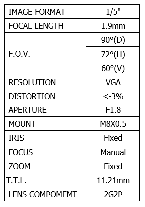 1/5", 1.9mm, medical lens, DFOV 90degree,distortion less 3%, F1.8, M8*0.5 ,TTL 11.21mm,very compact size, for medical Images |